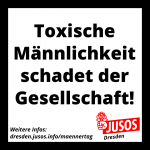 Wir bieten in diesem Rahmen einen Workshop zum Thema toxische Männlichkeit an. Der Workshop ist für alle Gender offen. Gemeinsam werden wir erarbeiten, was man unter dem Begriff der toxischen Männlichkeit überhaupt versteht, wie man toxisch männliches Verhalten erkennt und welche Auswirkung es auf unser Zusammenleben hat. In mehreren Kleingruppenphasen und Inputs wollen wir versuchen zu verstehen, wo ihre Ursachen liegen und wie auch wir dazu beitragen. Der Workshop soll dabei einen Rahmen zur kontinuierlichen Selbstreflektion bieten und ein Ort sein, um sich offen über Erfahrungen und mögliche Lösungsstrategien im Umgang mit toxisch männlichen Verhalten auszutauschen.